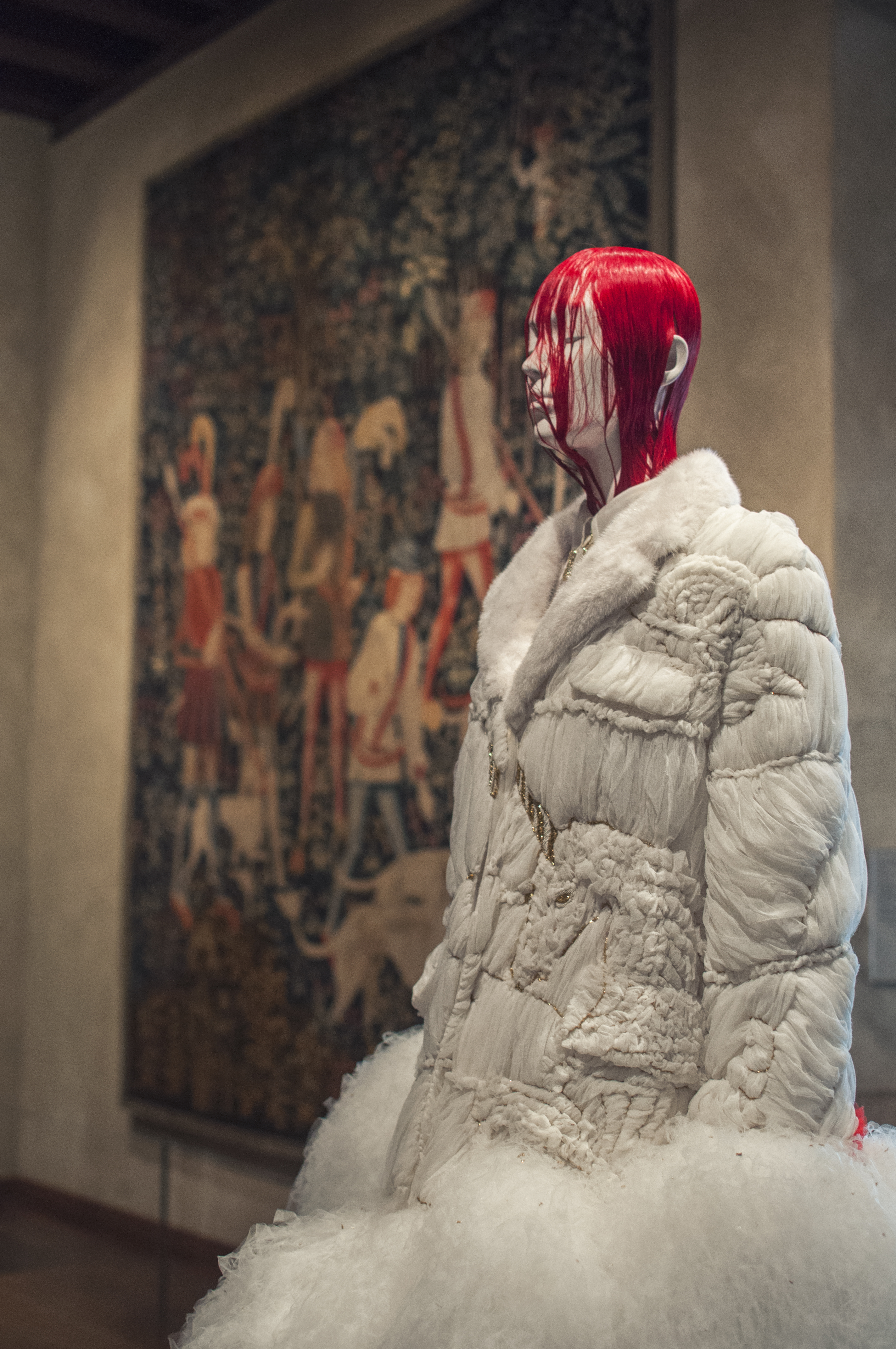 W jednej z kaplic, o cechach typowych dla architektury romańskiej (grube mury, małe okna, łuki) stoi postać w białej szacie. Czytam w opisie, że stożkowata, surowa suknia inspirowana jest sakramentami chrztu i pierwszej komunii świętej. Na tle słynnych gobelinów występuje z kolei kreacja skomponowana z setek tiulowych wstążek, w którą, gdy przyjrzeć się bliżej, wpisany jest jednorożec; haftowany złotą nicią ginie w miękkich fałdach materiału. Na twarzy manekina spływają, niczym strużki krwi, czerwone włosy. Dramatycznie. Drapieżnie. Intrygująco. Naszą uwagę zwraca akcent polski i suknia inspirowana obrazem Matki Boskiej Częstochowskiej (aksamitna peleryna ozdobiona gwiazdami). Postaci wiszą niemal pod sufitem, jak gdyby lewitowały.